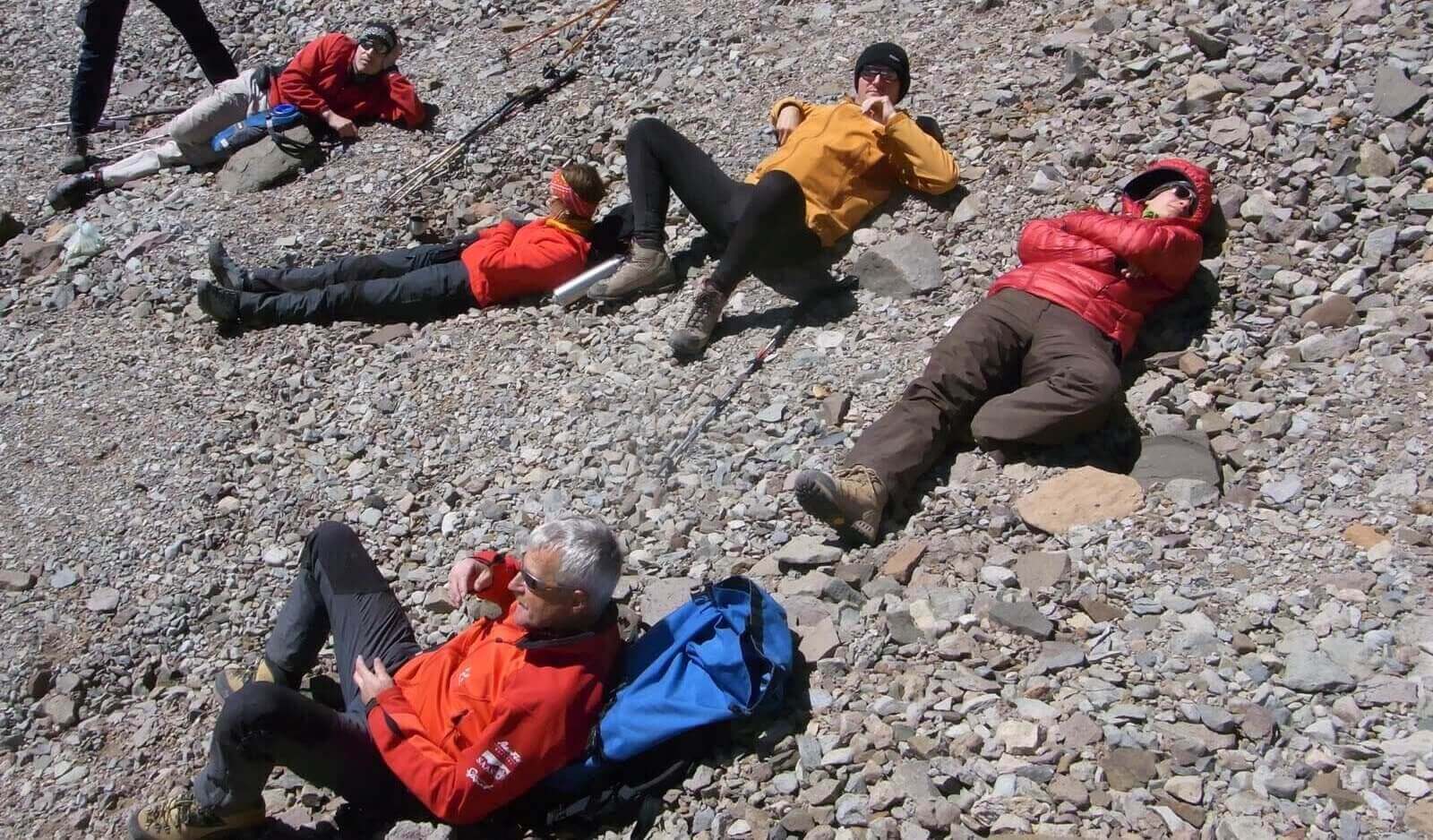 Der Schnee wird härter, die Steigeisen werden angezogen. Schwerarbeit auf dieser Höhe. Dann geht es Schritt für Schritt weiter, langsam, zwei Stunden lang bis zur ersten kurzen Pause. Eine längere folgt dann nach drei Stunden auf 6’300 Metern. Jetzt noch ein Steilhang, dann folgt die Zielgerade zum letzten Stopp vor dem letzten Aufstieg. Nicht steil ist der Weg, aber lang, windend, steigend, weit über dem Meeresspiegel. Ein teilweise eisiger Weg in einem steilen Hang. Eine potentiell mehr als 2’000 m lange Rutschpartie bis zum Base Camp Plaza de Mulas hinunter. Wir bleiben auf dem Weg. Steigen langsam höher und höher. Schritt um Schritt. Alle fünf Minuten folgt eine minütige Pause. Nach 7,5 Stunden erreichen wir den überhängenden Felsen auf 6’700 m, die letzte Raststätte vor dem Gipfelaufstieg.
