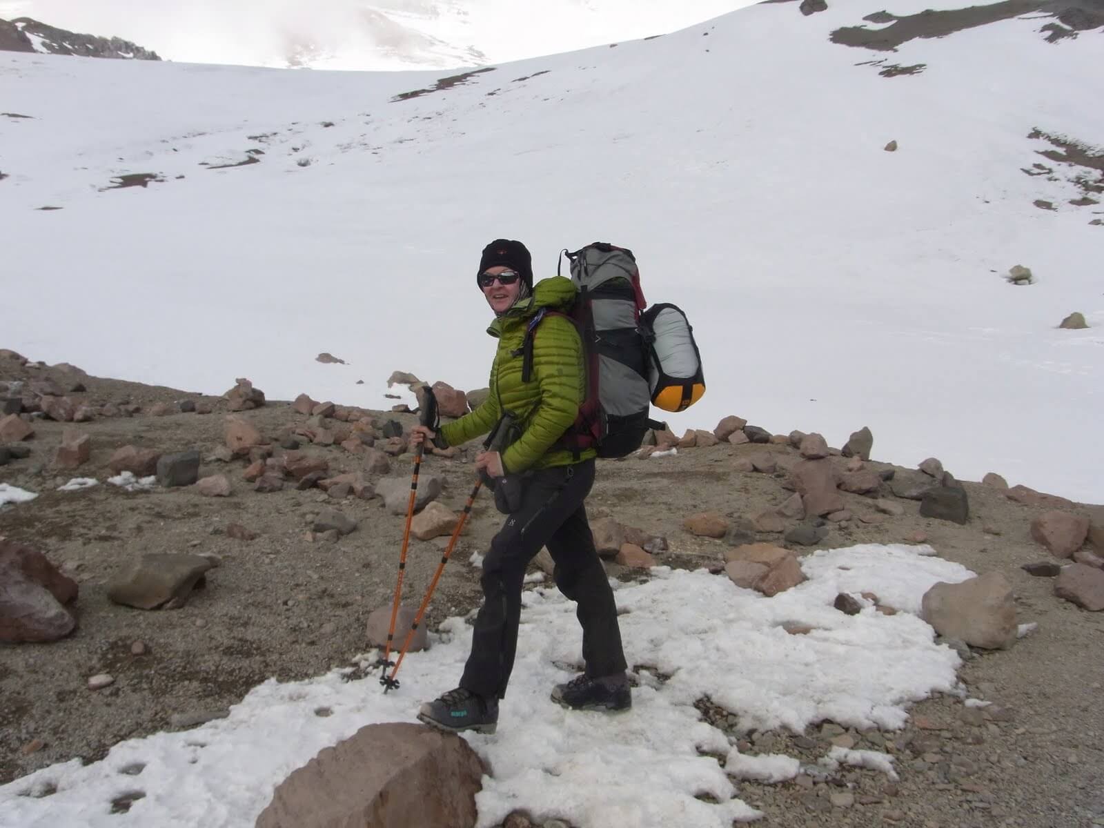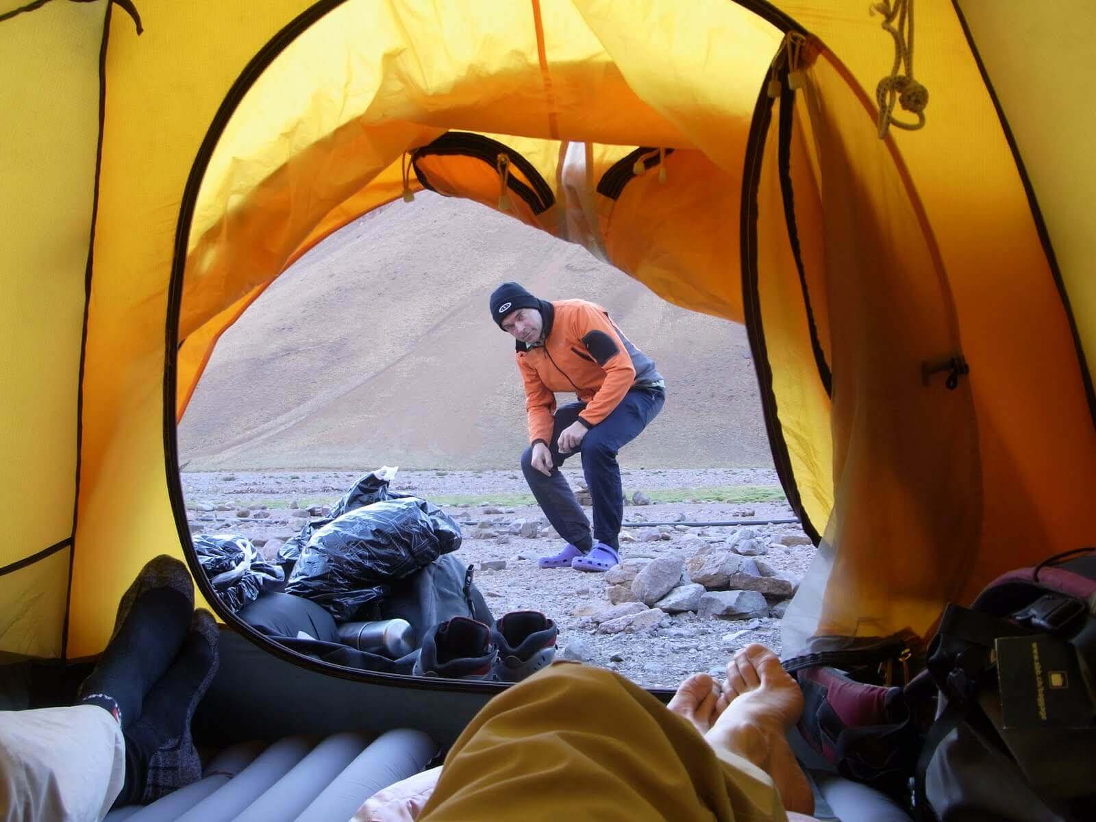 Vom Basecamp aus stiegen wir über eine Geröllhalde ins Hoch-Lager 1 auf. Danach ging’s weiter steil bergauf ins Lager 2 – Guanacos und dann zur Cholera, das letzte Camp vor dem Gipfeltag auf 6000 Metern über Meer. Die Nacht vor dem Gipfelsturm war kurz: Das Zelt war tiefgefroren. Alle warmen Kleidungsstücke, Schuhe und Thermoskannen im Schlafsack eingepackt!