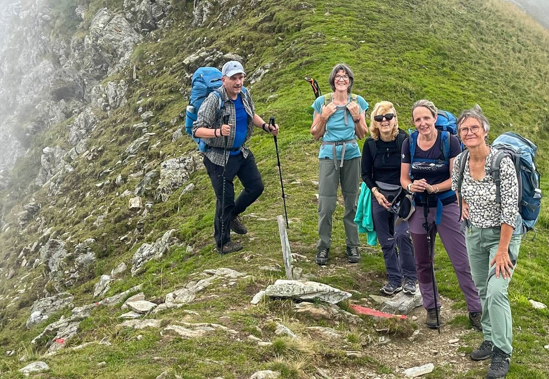 Am Lago d’Orta ein erster Halt, „Urlauberambiente“ bei Espresso und Cornetto. In Carcoforo wars dann mit dem Genuss vorbei, der fordernde Aufstieg begann. Die obersten Bergspitzen waren in Nebel gehüllt, der anfängliche Sonnenschein verblich zu unseren Gunsten, denn Schwitzen war angesagt. Beim nächsten Halt verwöhnte uns Sabine mit Melone und Rohschinken und war froh etwas Gewicht (natürlich vom Rucksack!) loszuwerden. Bis wir nach 3 Stunden (1100 Höhenmeter) auf dem Colle del Terma angekommen waren, wurde uns die Sicht durch Nebel leider verwehrt. Sanft war dann der Abstieg nach Rima auf federndem Boden durch Weideland und Wald.