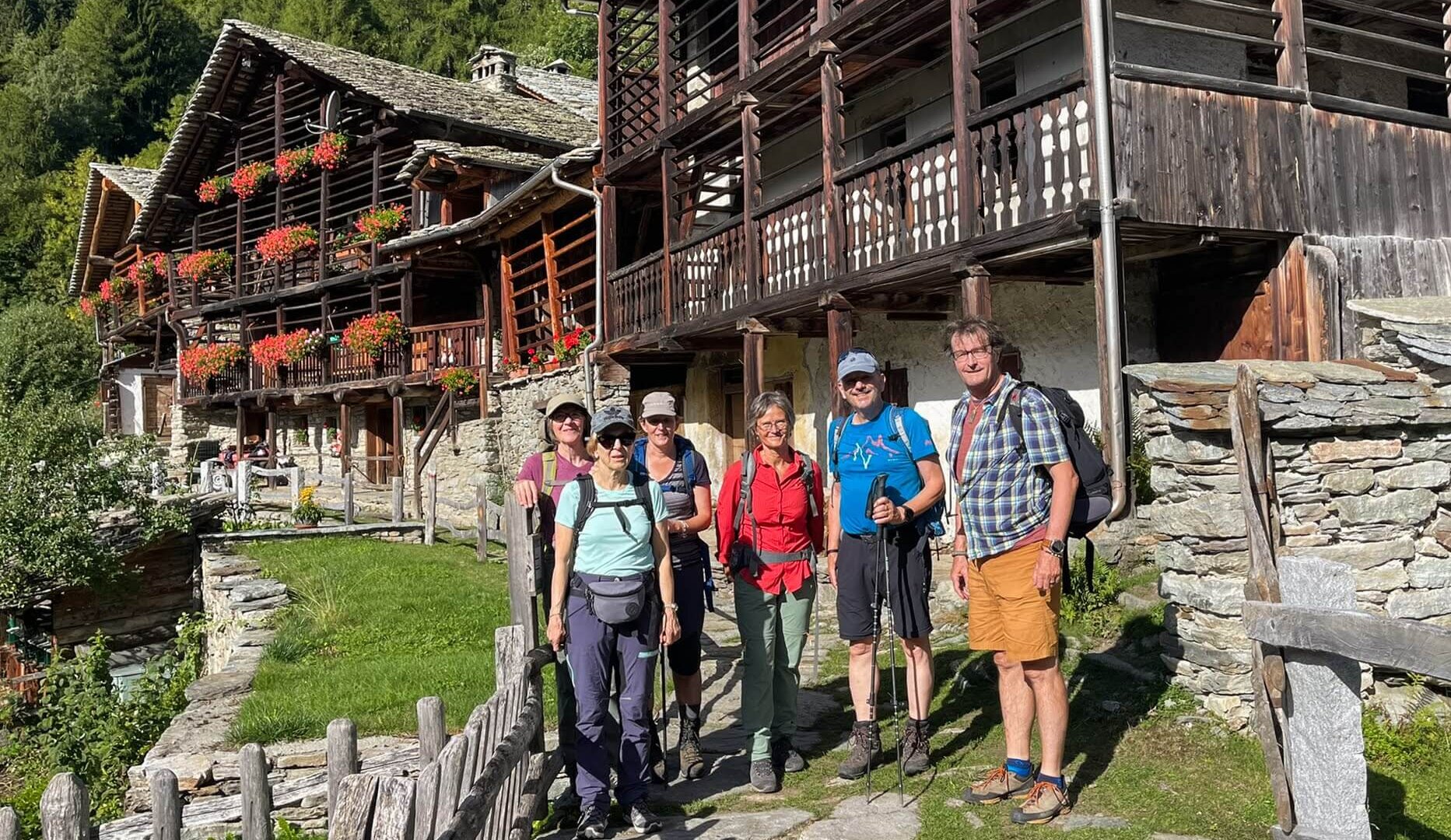 Das malerische Dörfchen auf dem Talboden begeisterte jeden – kunstvolles Handwerk, Walser-Architektur und ein gut erhaltenes und gepflegtes Dorfbild waren die Anstrengung vom Tage wert. Bei Signora Giovanna waren wir gut aufgehoben und genossen den Käse, die obligate Pasta sowie ein wohlschmeckendes Fleischgericht. Frühes Aufstehen, frühe Bettruhe!