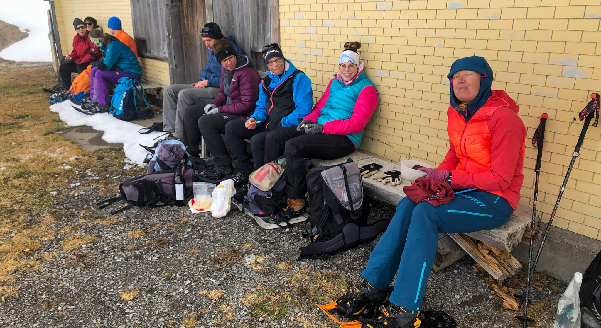 Bald nach dem Mittagessen erreichten wir den Grünenbergpass. Ursprünglich war es ein Saumweg zwischen dem Emmental und Interlaken, im Zweiten Weltkrieg wurde eine unbefestigte Militärstrasse mit Sperrstellen errichtet. Erst auf den zweiten Blick wird ersichtlich, dass dieser Pass neben dem Thunersee und dem Brünigpass der einzige Zugang von Norden zum östlichen Berner Oberland ist. Der Pass macht seinem Namen alle Ehre und wir konnten im Schatten des Waldes fast bis zum Ziel auf Schnee laufen. Nach 14.4 km, +380 und -900 Hm war dieses im Innereriz erreicht, wo sich der Blick auf die Sichle – den Passübergang ins Justistal – und die steilen Felswände der sieben Hengste öffnete.
