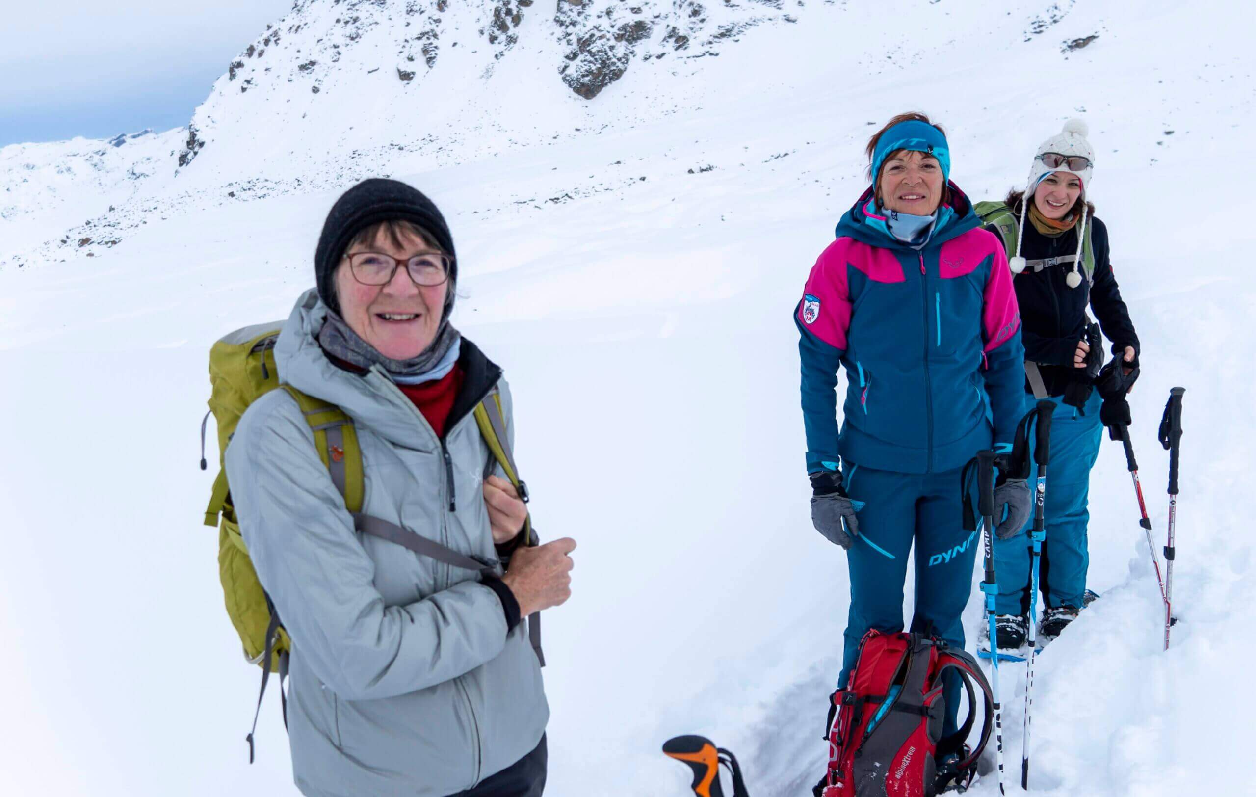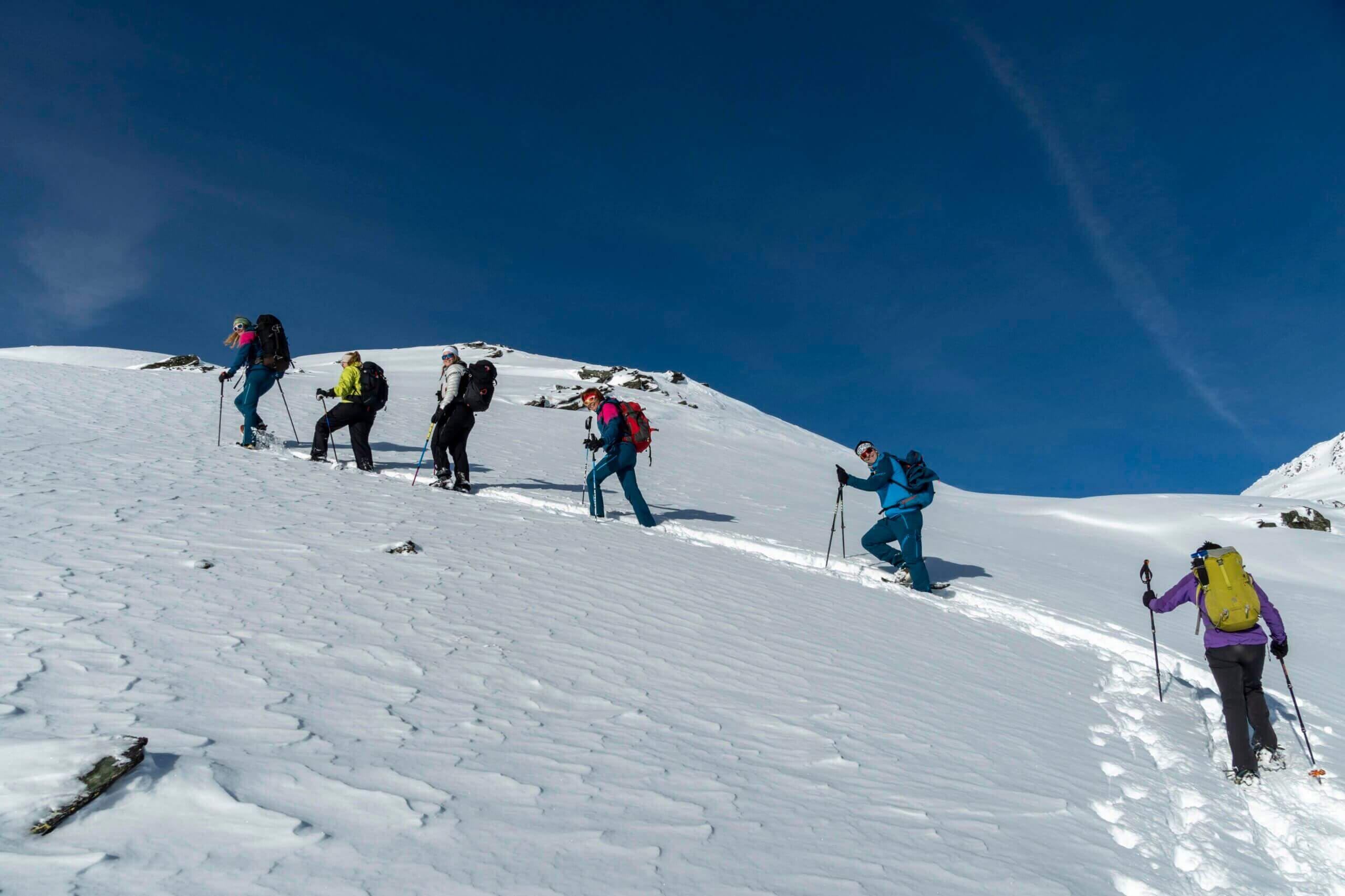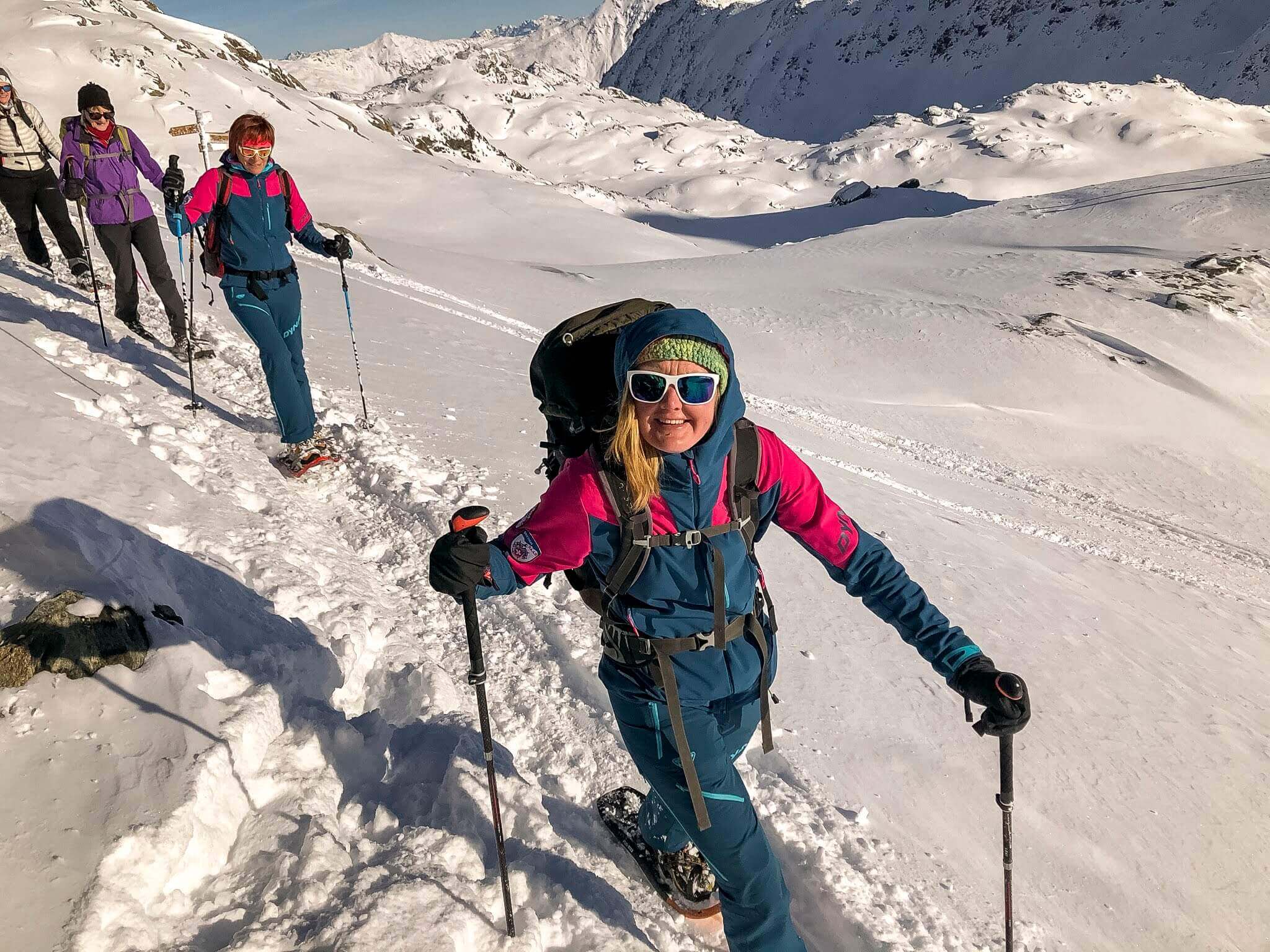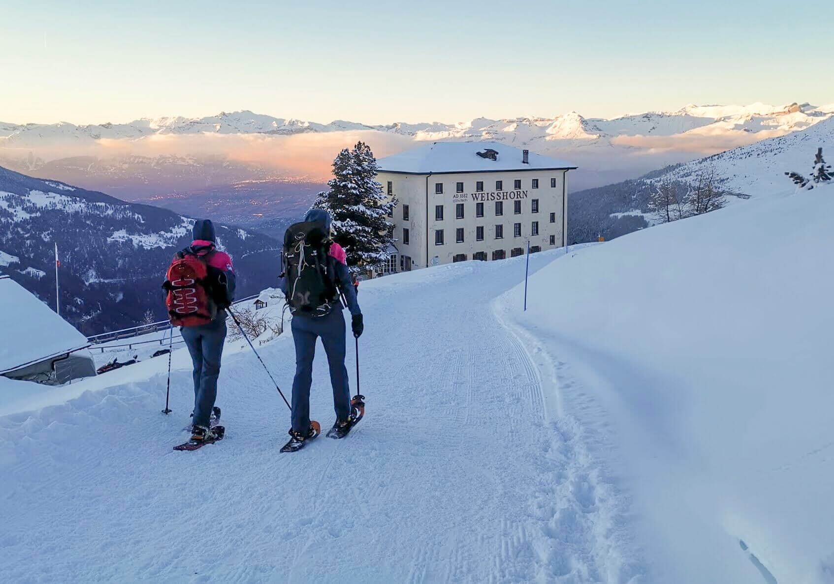 Von dort an hiess es Schneeschuhe anziehen und im gefolgten Gänsemarsch in Richtung Pass …. zu laufen. Dort angekommen genossen wir den wunderschöner Ausblick auf die Walliser Berge. Nach einer kurzen Pause und einer Lektion über die jeweiligen Berge ging es dann auch schon weiter Richtung Hotel Weisshorn, bei welchem uns eine warme Mahlzeit versprochen wurde.